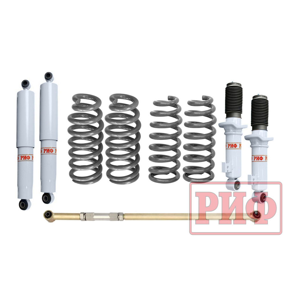 Все компоненты лифт-комплектов РИФ разработаны специально для эксплуатации внедорожника в тяжелых условиях на различных дорожных покрытиях. Амортизаторы с технологией R-Air и пружины РИФ не только компенсируют вес установленного на внедорожнике дополнительного оборудования (бамперов, порогов, дополнительных топливных баков, лебедок и прочего), но также существенно повышают грузоподъемность автомобиля.