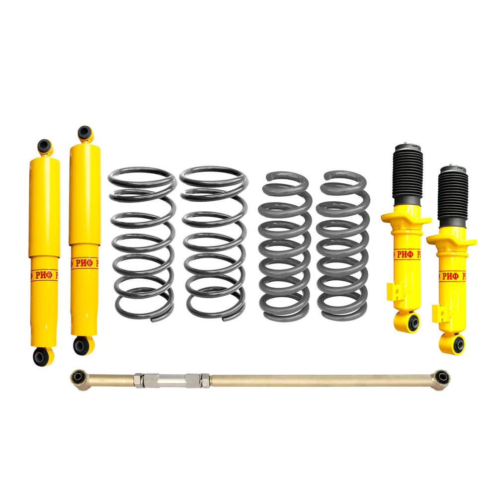 Все компоненты лифт-комплектов РИФ разработаны специально для эксплуатации внедорожника в тяжелых условиях на различных дорожных покрытиях. Амортизаторы с технологией R-Air и пружины РИФ не только компенсируют вес установленного на внедорожнике дополнительного оборудования (бамперов, порогов, дополнительных топливных баков, лебедок и прочего), но также существенно повышают грузоподъемность автомобиля.