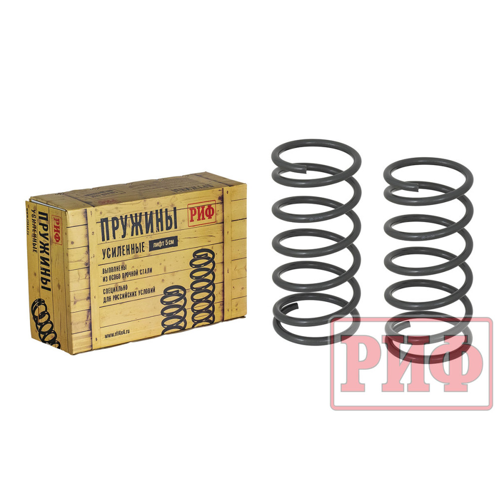 Пружины РИФ изготовлены из высококачественной стали и предназначены специально для подготовки внедорожника к тяжелым условиям эксплуатации. Они позволяют «отлифтовать» внедорожник и увеличить его грузоподъемность, компенсировав при этом вес установленного дополнительного оборудования – силовых бамперов, багажника, лебедки.