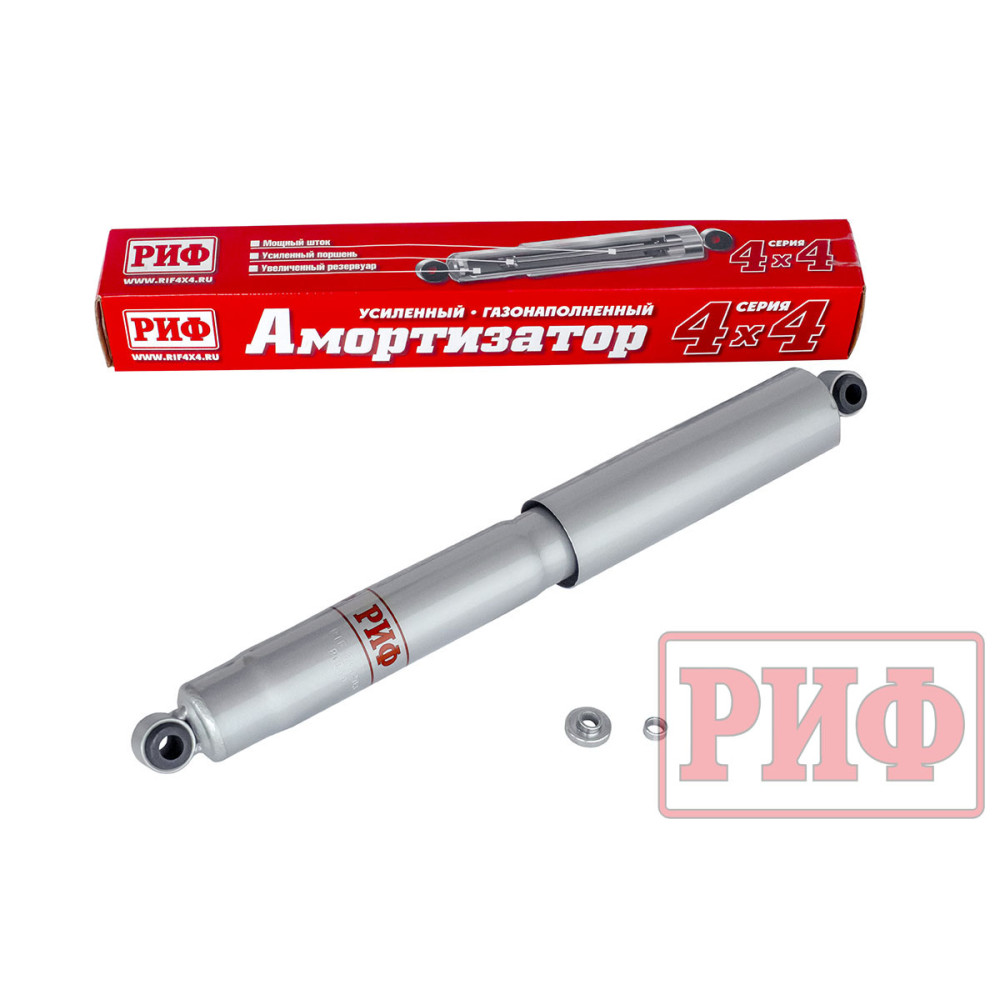 Гидравлические амортизаторы "РИФ" с газовым подпором. Газ, находящийся под давлением в компенсационной камере наружной трубы, позволяет повысить устойчивость амортизатора к высоким нагрузкам. Масло под давлением газа менее подвержено эффекту кавитации, а значит и меньше вспенивается, в отличие от обычного гидравлического амортизатора. Также, благодаря увеличенному масляному резервуару с большим количеством масла, усиленному штоку и поршню, амортизаторы "РИФ" обладают длительным рабочим ресурсом и обеспечивают великолепную стабильность рабочих характеристик при длительной езде по дорогам общего пользования, отличную курсовую устойчивость, хорошую артикуляцию подвески и приятную плавность хода на бездорожье.