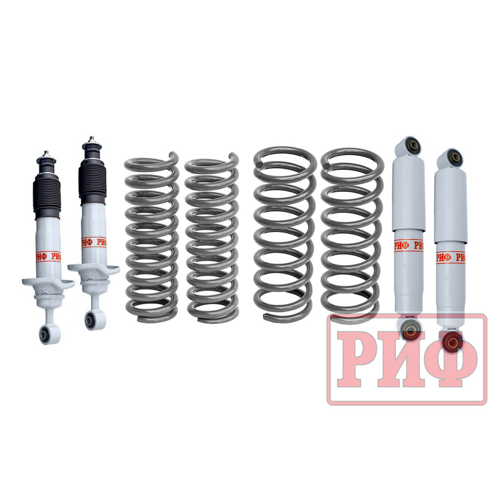Все компоненты лифт-комплектов РИФ разработаны специально для эксплуатации внедорожника в тяжелых условиях на различных дорожных покрытиях. Амортизаторы с технологией R-Air и пружины РИФ не только компенсируют вес установленного на внедорожнике дополнительного оборудования (бамперов, порогов, дополнительных топливных баков, лебедок и прочего), но также существенно повышают грузоподъемность автомобиля.