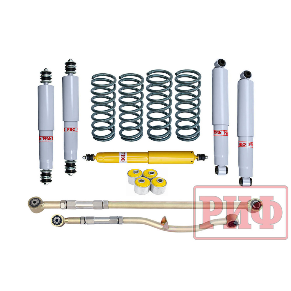 Все компоненты лифт-комплектов РИФ разработаны специально для эксплуатации внедорожника в тяжелых условиях на различных дорожных покрытиях. Рессоры, амортизаторы с технологией Foam Cell и пружины РИФ не только компенсируют вес установленного на внедорожнике дополнительного оборудования (бамперов, порогов, дополнительных топливных баков, лебедок и прочего), но также существенно повышают грузоподъемность автомобиля. Удлиненные стремянки и серьги РИФ произведены из высококачественных материалов и имеют увеличенный запас прочности. Рессорные втулки РИФ изготовлены из полиуретана обладает высокой упругостью, износостойкостью и термоустойчивостью к высоким или низким температурам.