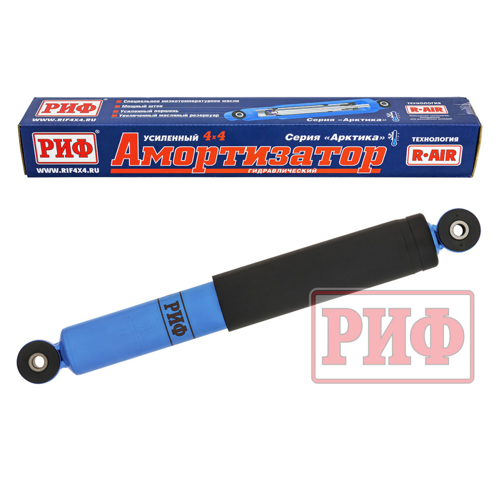 Главной особенностью амортизаторов «РИФ» «Арктической» серии является использование специального масла с особо низким показателем рабочей температуры: до -55 °С. При экстремально низких температурах масло не замерзает, а остаётся текучим, что позволяет амортизатору выполнять свои функции даже в столь сложных условиях, обеспечивая комфортную и безопасную езду. При этом данное масло позволяет использовать амортизаторы и в жаркое время года без изменения рабочих качеств амортизатора. Более того, в амортизаторах «Арктика» применена уникальная технология «R-AIR», позволяющая повысить устойчивость гидравлического амортизатора к высоким нагрузкам. Внутри амортизатора находится герметичная заполненная воздухом камера из эластичной резины, создающая избыточное давление внутри амортизатора. Благодаря технологии «R-AIR» масло не вспенивается и дольше не закипает при длительных непрерывных нагрузках. Использование «R-AIR» даёт возможность отказаться от применения газа внутри амортизатора для обеспечения стабильности характеристик при больших нагрузках, что положительно сказывается на работе амортизатора в зимнее время. Благодаря увеличенному масляному резервуару с большим количеством масла, усиленным штоку и поршню, а также технологии «R-AIR», амортизаторы «РИФ» обладают длительным рабочим ресурсом и обеспечивают великолепную стабильность рабочих характеристик при продолжительной езде.