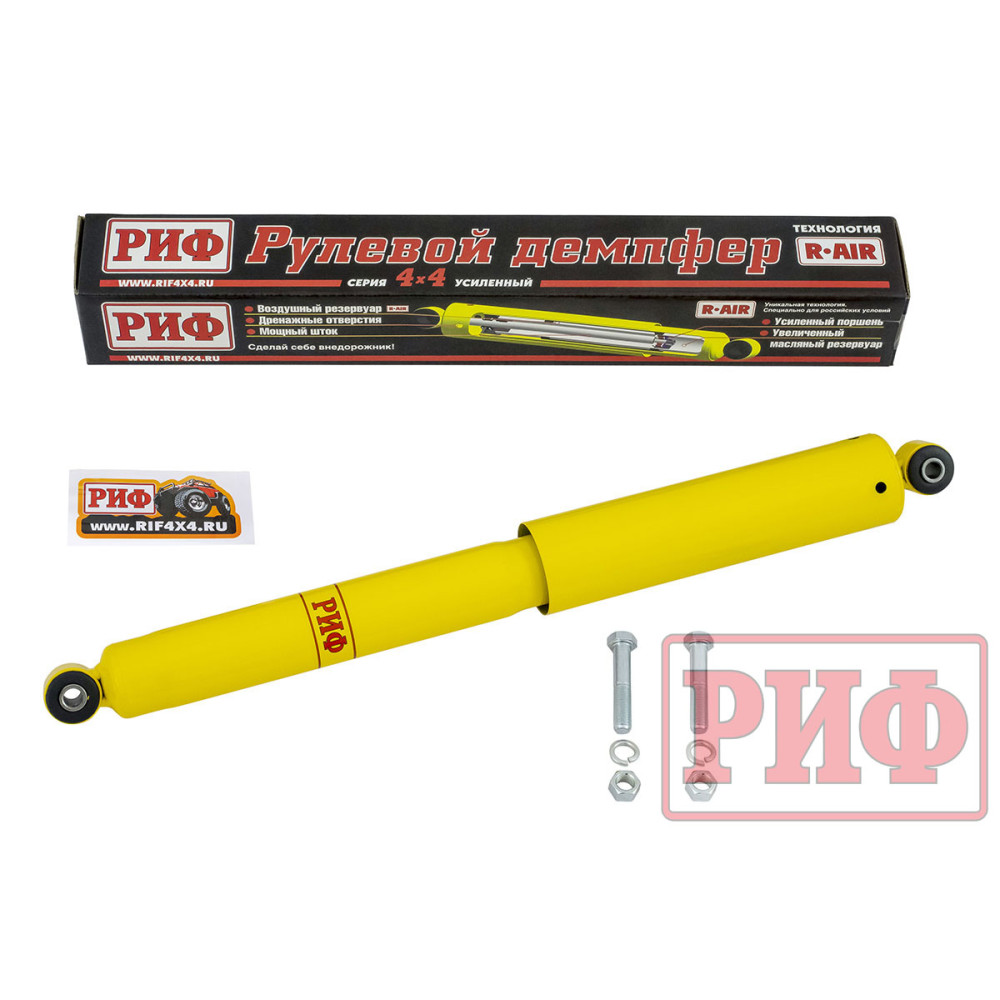 Демпфер РИФ устанавливается на штатные заводские крепления рулевого демпфера, однако, по-сравнению с заводским демпфером, он имеет усиленные характеристики. Благодаря своим характеристикам демпфер РИФ лучше справляется с высокими нагрузками, позволяет установить колеса большего диаметра и повышает уровень комфорта при управлении автомобилем.