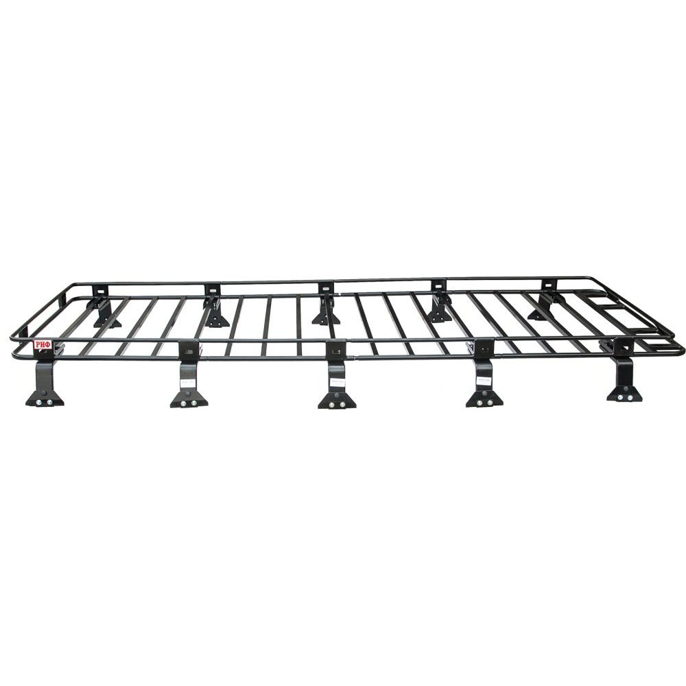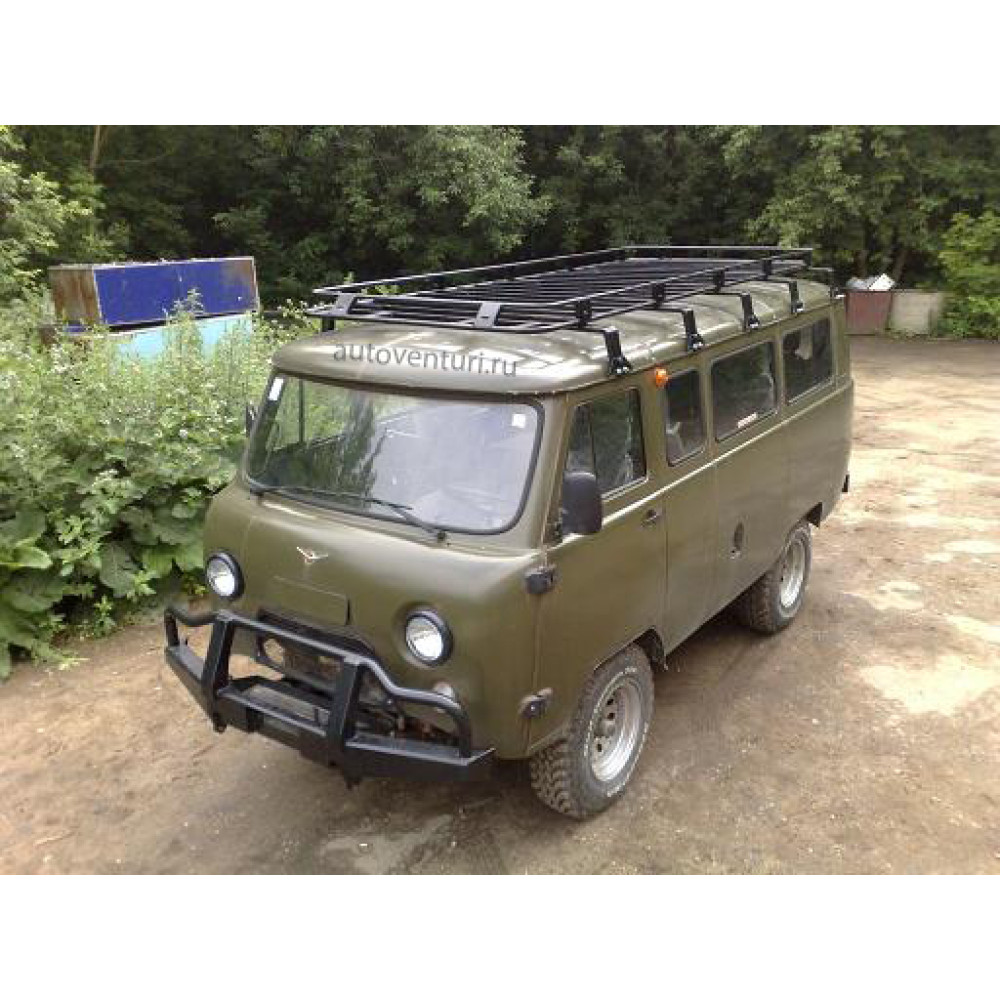 Корзина багажника представляет собой сборную конструкцию, состоящую из двух частей и двух вставок. Багажник обладает большой грузоподъемностью. Опоры сделаны регулируемыми по ширине и крепятся на водосточные канавки крыши. Багажник накрывает всю поверхность крыши «Буханки».