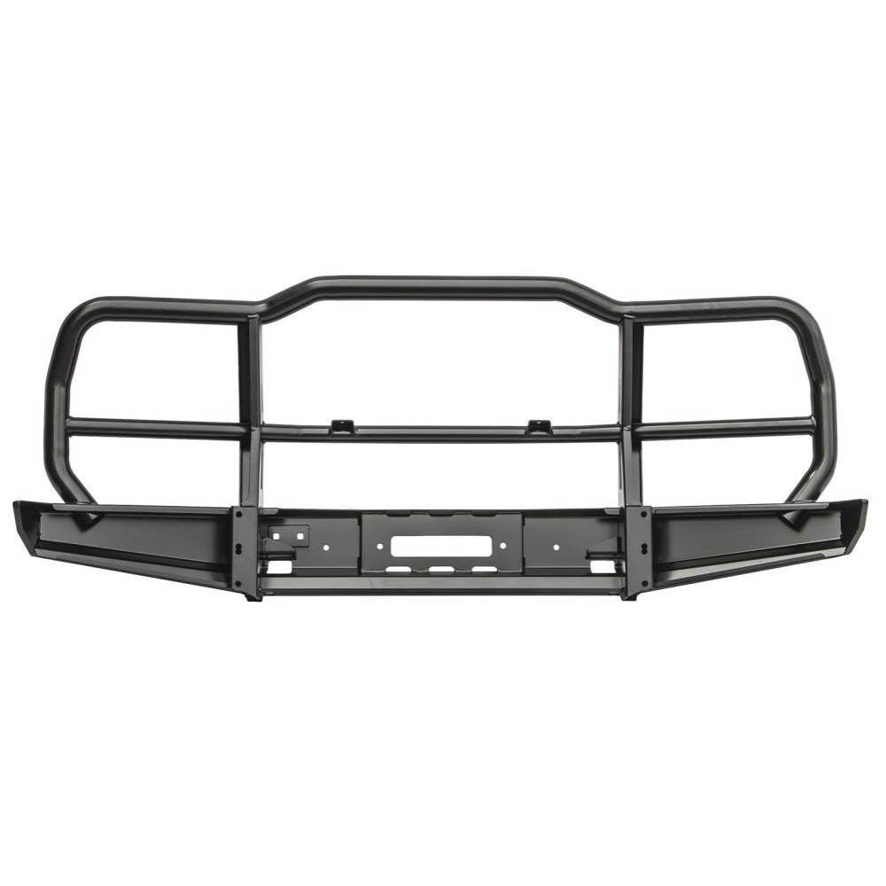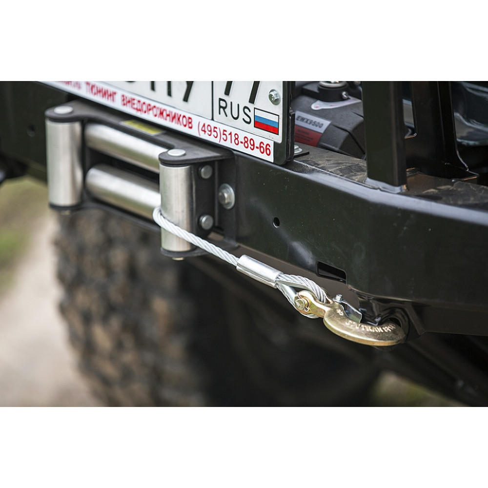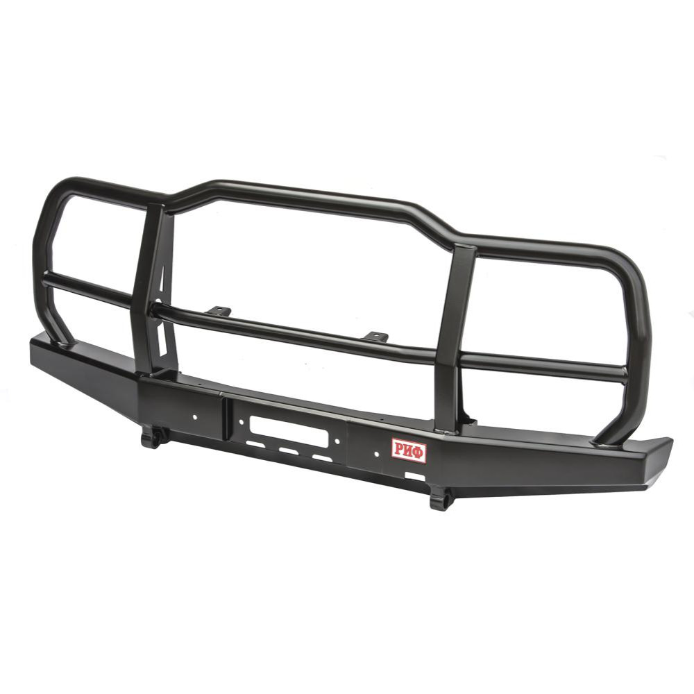 Бампер не оснащен интегрированной площадкой для лебедки, ее нужно докупать отдельно - площадка РИФ устанавливается в раму. В бампере имеется отверстие под трос лебедки. Бампер «РИФ» оборудован мощными упорами под реечный домкрат и буксирными проушинами для работы с рывковым тросом или буксировочной стропой.