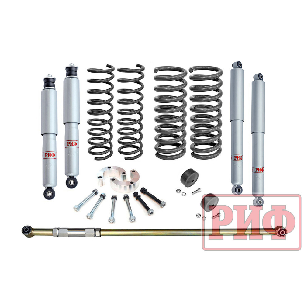 Полный комплект для «лифта» подвески автомобиля Chevrolet Niva на 2 дюйма. В комплект входят пружины увеличенной жесткости под 50мм «лифт» на переднюю и заднюю ось, комплект длинноходных и усиленных амортизаторов, кронштейн для переноса крепления тяги Панара и проставки под верхние шаровые опоры.