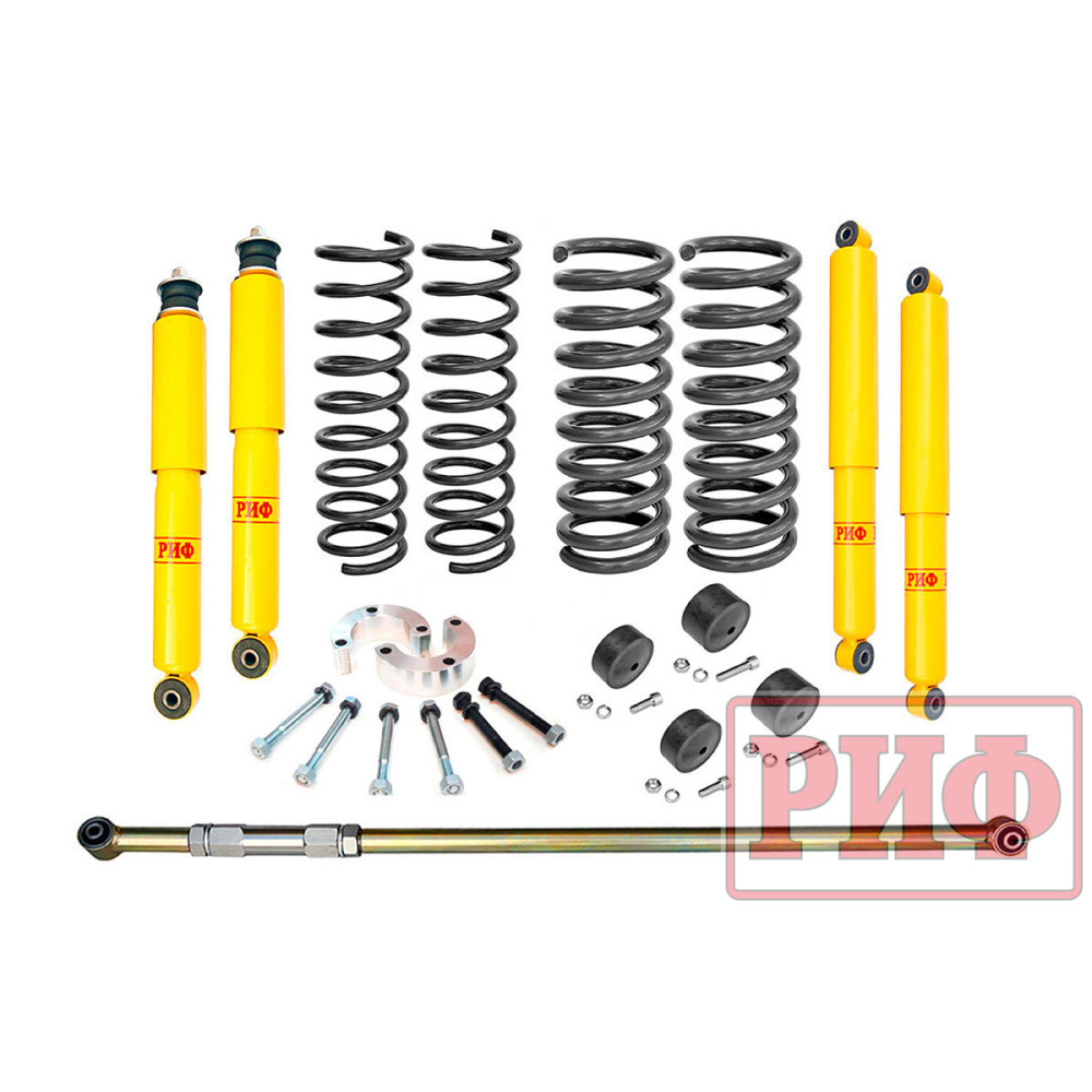 Полный комплект для «лифта» подвески автомобиля LADA Niva 21214М на 2 дюйма. В комплект входят пружины увеличенной жесткости под 50 мм «лифт» на переднюю и заднюю ось, комплект длинноходных и усиленных амортизаторов, кронштейн для переноса крепления тяги Панара и проставки под верхние шаровые опоры.