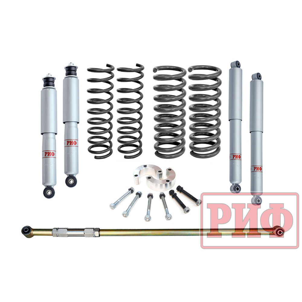 Одним из важнейших этапов внедорожного тюнинга является установка усиленной подвески, позволяющей улучшить поведение автомобиля на любом рельефе, улучшить геометрическую проходимость, повысить энергоёмкость подвески. Все компоненты лифт-комплектов РИФ разработаны специально для эксплуатации внедорожника в тяжелых условиях на различных дорожных покрытиях. Амортизаторы с технологией R-AIR и пружины РИФ не только компенсируют вес установленного на внедорожнике дополнительного оборудования (бамперов, порогов, дополнительных топливных баков, лебедок и прочего), но также существенно повышают грузоподъемность автомобиля. Усиленная подвеска РИФ великолепно «держит» и тяжелое бездорожье, и разбитый грейдер, и асфальтированное шоссе с крутыми поворотами - автомобиль остается устойчивым, управляемым, и что немаловажно, комфортным. Вся продукция, производимая под маркой РИФ, не уступает по качеству зарубежным брендам, а некоторые из них превосходит по ряду характеристик, при этом являясь лидером по соотношению цена-качества на российском рынке. Состав комплекта: