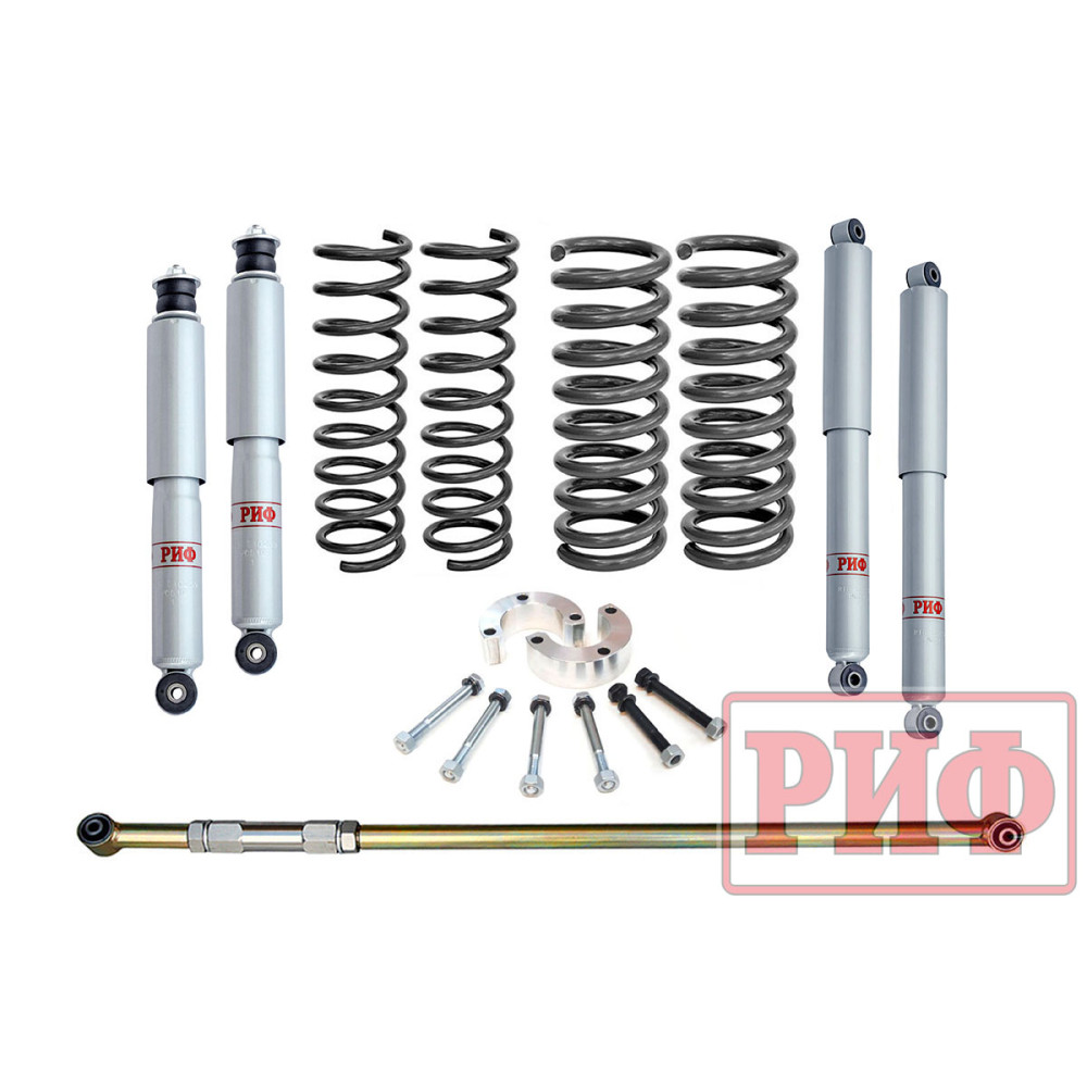 Все компоненты лифт-комплектов РИФ разработаны специально для эксплуатации внедорожника в тяжелых условиях на различных дорожных покрытиях. Амортизаторы с технологией R-Air и пружины РИФ не только компенсируют вес установленного на внедорожнике дополнительного оборудования (бамперов, порогов, дополнительных топливных баков, лебедок и прочего), но также существенно повышают грузоподъемность автомобиля.